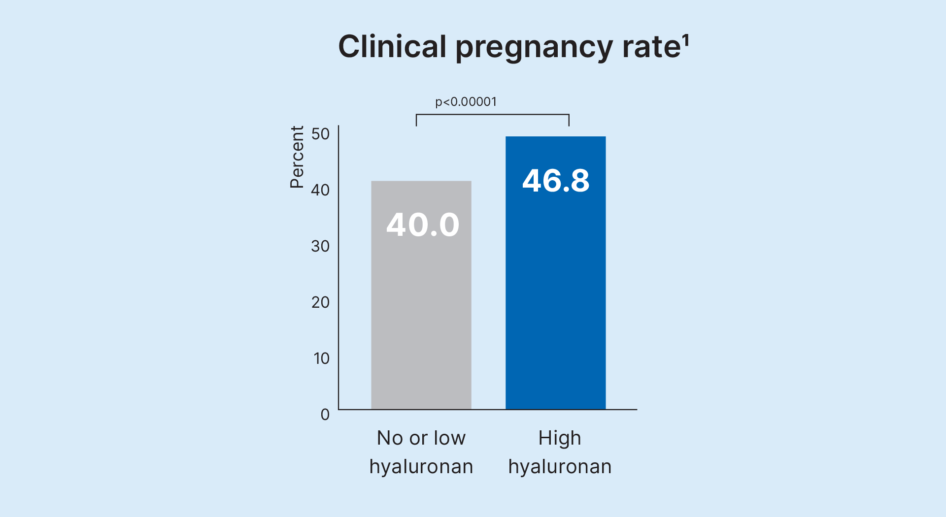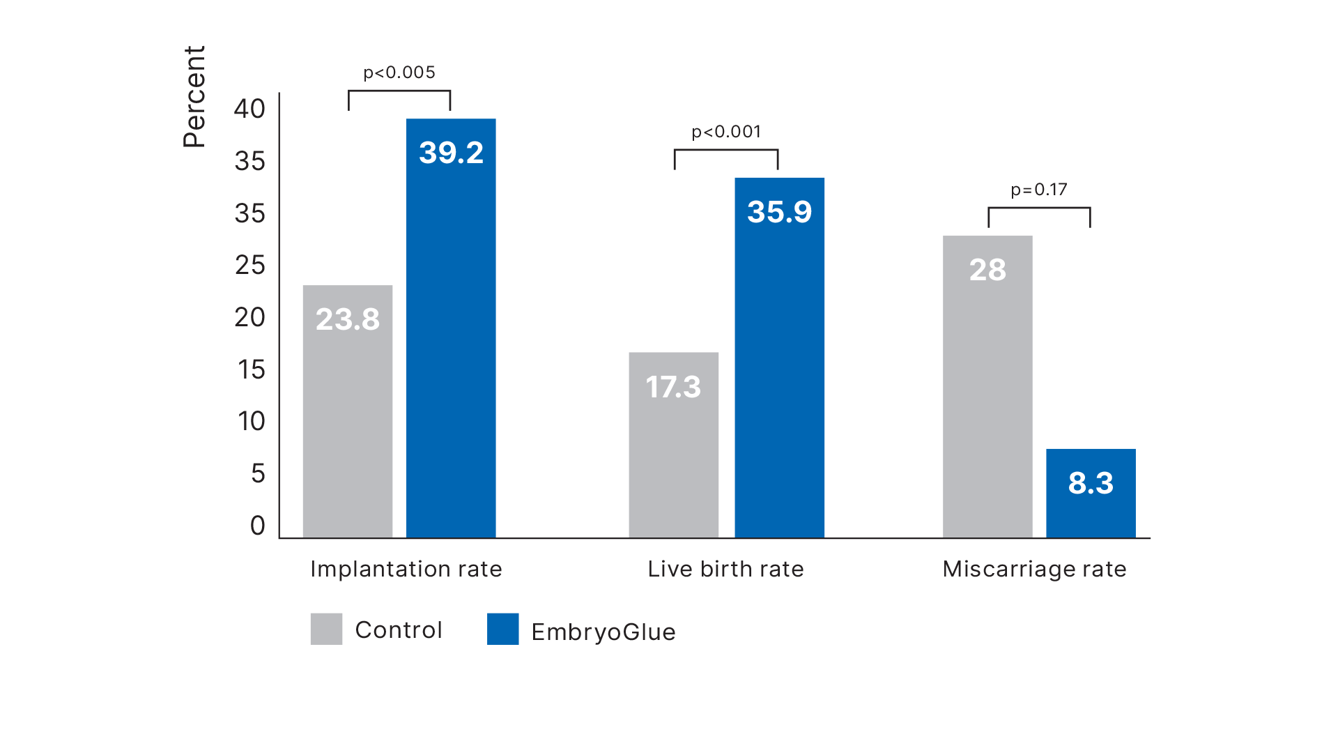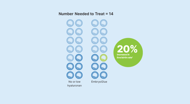 The live birth rate increased from 33.3% to 40.2% with the use of EmbryoGlue. According to a number needed to treat (NNT) calculation, based on the Cochrane Review, one additional live birth was achieved for every 14 transfers. For a clinic with 700 cycles annually, this is one additional baby born per week, or a 20% increase in live births1.