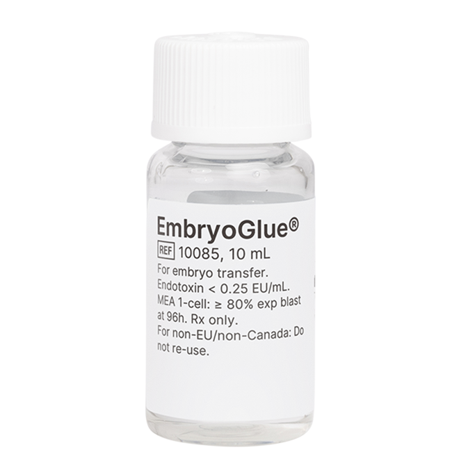 EmbryoGlue is a medium developed exclusively for embryo transfer and is the only existing transfer medium with a proven implantationenhancing effect1. EmbryoGlue has the basic composition of a rich blastocyst culture medium and contains recombinant albumin and a high concentration of hyaluronan. It can be used for transfer of all embryo developmental stages, including cleavage embryos, blastocysts after assisted hatching, biopsied embryos and cryopreservation. The use of EmbryoGlue for embryo transfer can increase the clinical pregnancy rate and live birth rate1.