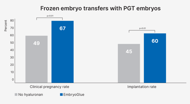 Data indicates that PGT embryos benefits from being transferred in EmbryoGlue. A retrospective study showed the clinical outcomes from 830 transferred embryos (557 in the control group with no hyaluronan added and 273 transferred with EmbryoGlue). The data showed an increase in both implantation rate and clinical pregnancy rate20.