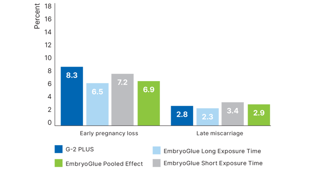 Adeniyi et al. (2021) investigated a total of 3391 fresh embryo transfers in a study between 2011 and 2015 using three different protocols – low hyaluronic acid (G-2 PLUS), short (10-30 min) EmbryoGlue exposure, and long (2-4h) EmbryoGlue exposure. The purpose of the study was to assess the safety and efficacy of implementing EmbryoGlue as a transfer medium. The results showed no increase in pregnancy loss or miscarriage and an overall improvement in live birth events17.
